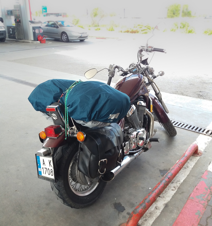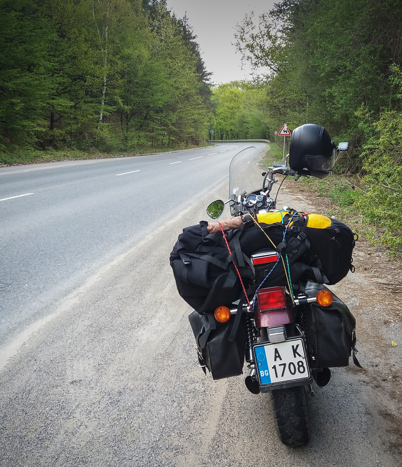 17:30 – „Чичо Ташо“ е метнат на задната седалка на маторя и е яко овързан с въжета и колани. Готов е да го шиба вятъра… Доливам гориво, проверявам за сетен път КАПАЧКАТА на маслото дали си е на мястото и тръгвам да гоня залеза. Чакат ме 211км до Павел Баня. Нетипично за повечето моторджии на изхода на Бургас хващам магистралата. Просто за последните месеци няколко пъти минавах по стария път през Айтос, Карнобат и Петолъчката – пътя не е нищо особено, дори мога да кажа, че не ми харесва – кръпки, неравности и познати пейзажи. Нямам търпение да стъпя на подбалканския след Сливен – там е друга песен. Като казах песен – главата ми е пълна с такива и си ги тананикам по пътя, а мотора хармонично приглася. От време на време шлема ми отнася по някоя „сачма“ – муха, пчела или друг разсеян добитък… Може пък да са се опитвали да влязат в контакт с бръмбарите от вътрешната страна на каската. Наближавам отбивката за Сливен и решавам да източа бойлера на следващата паркинг зона. За мой ужас докато намалям скоростта ми светва лампата на таблото – мотора прегрява. Още не съм спрял, а вече чувам как течността в радиатора ври. Успокоявам се, че поне сме в синхрон с коня – аз пускам вода, той също. Само дето неговата локва е по-голяма от моята…