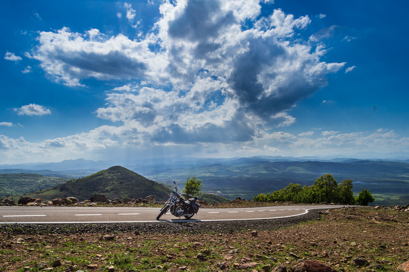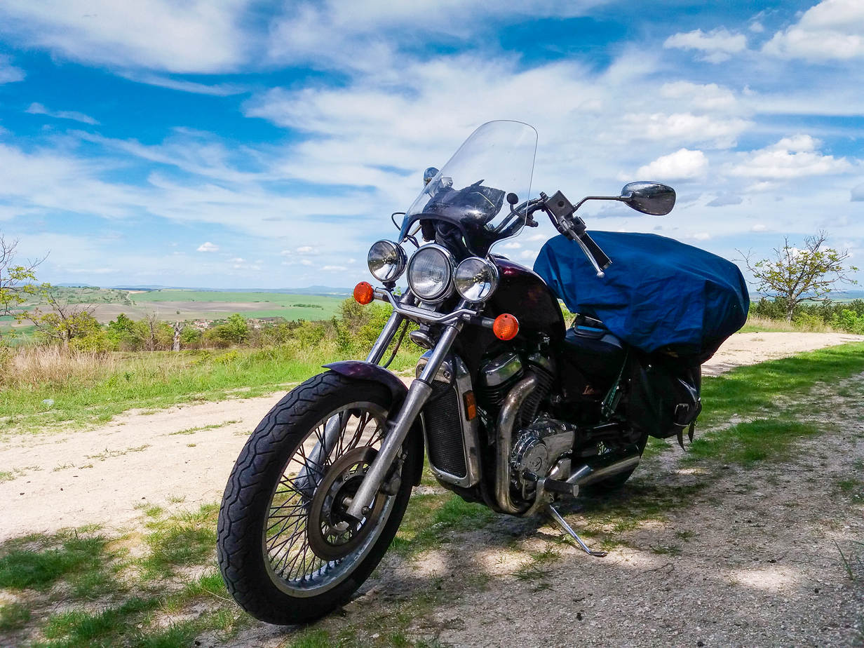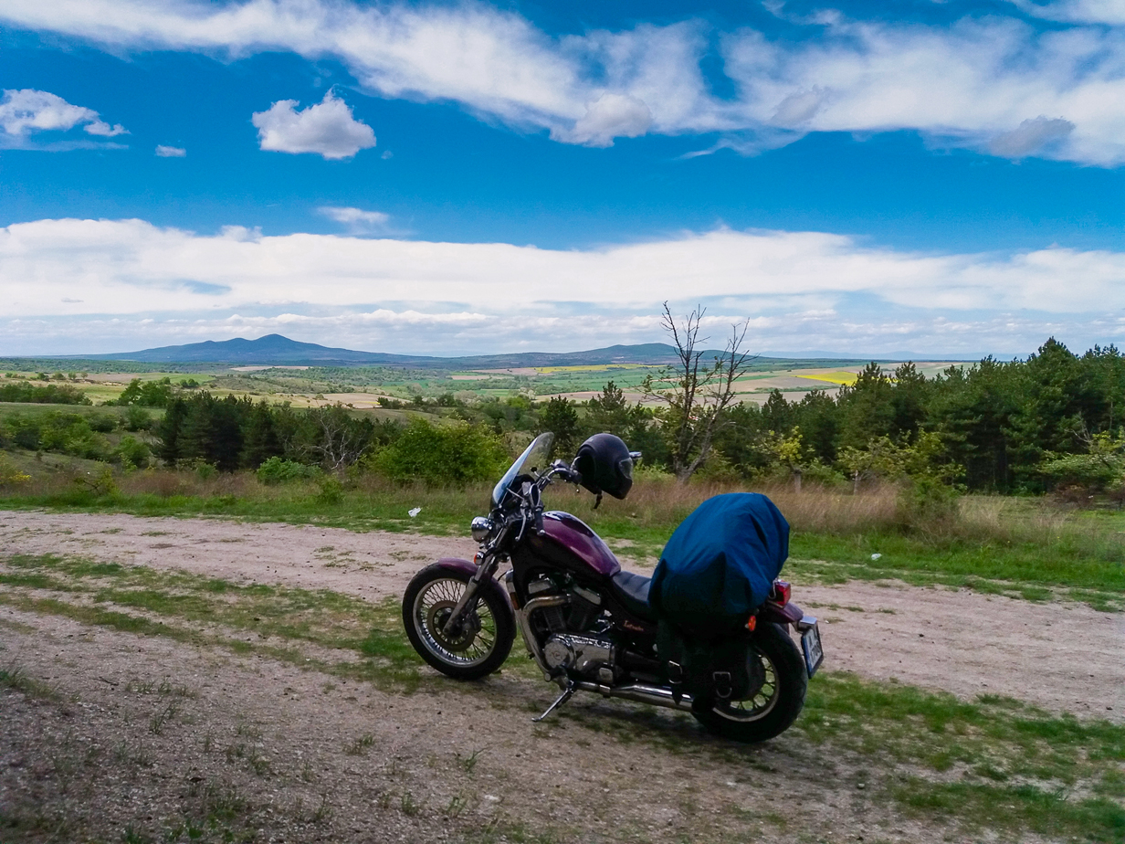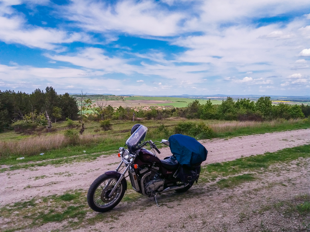 Най-после монтирам камерата на каската, но съвсем скоро слизам от планината и стъпвам в скучното поле. Макар и непознат пътя губи чара си, защото го виждам прав напред с километри. Освен това времето вече е ясно, слънцето пече насреща ми и градусите са поне с 10 нагоре. Е, не – пак ще се спира. Свалям камерата и се разсъбличам. Температурните амплитуди направо почват да ме дразнят. За по-малко от час се редуват студ и жега, дъжд и слънце. Казвам си, че това му е чара на мотора и хайде ухилен към София. Който иска комфорт да се вози в кола.