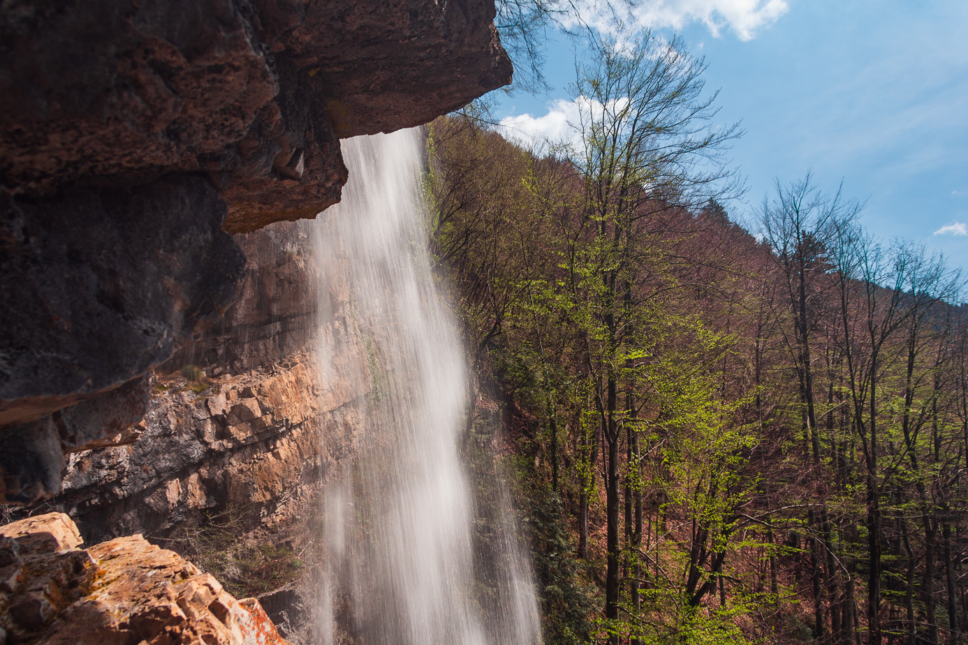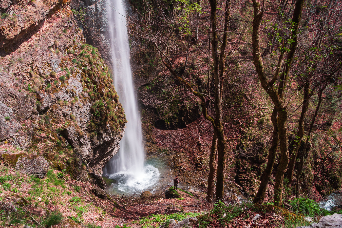 Прави ми впечатление че отвсякъде бреговете са опасани с огради: бодлива тел и натрупани на камари трънливи клонаци. Пресичам скалното корито в участъка без бодлива тел. На отсрещната страна се налага да се промъкна през трънливата част на оградата, но си намирам местенце откъдето са слизали и други двукраки. После тръгвам по пътеката криволичеща по високото. Скалите се снишават и пътеката тръгва надолу през гъсталака от дървета и храсти. Не успявам да открия път до реката. По цялото ѝ протежение брега е ограден с камари от бодливи клони. Няколкостотин метра по течението – същата картинка. Дори излизам на открито след дърветата. Тучно зелено пасище, но и тук – същата работа – слизането до водата е невъзможно. Връщам се обратно към по-високия бряг сред дърветата. Вече съм решен да се спусна от горе по някоя дива лоза, само и само да се добера до водопада. Докато се оглеждам за подходящите помощни средства – проблясък – непосредствено под скалите – тясна пролука в храстите и стъпкан участък в трънливия плет. Явно докато съм слизал по стръмното не съм видял мястото. Промушвам се и повече пречки няма. Крача уверено към водопада. Насрещния вятър тъпче в ноздрите ми засилваща се воня на леш. Двеста метра по-натам вече виждам водопада, пещера и източника на миризмата. Точно под скалите на входа на пещерата откривам полуразложения труп на говедо. За мой късмет водопада е малко след това и посоката на вятъра оставя ароматите зад гърба ми. Успявам да снимам от различни места без да се налага да си запушвам носа. Трупът проснат на камъните ми дава обяснение на всичките тия огради по бреговете горе. Едва ли е изолиран случай. Района е осеян с кошари. Овце и говеда пасат по поляните над реката. Явно случаите на паднали животни са били доста, за да принудят местните да обезопасят скалите. Но както вече стана ясно – винаги ще се намери някое говедо, което да намери път надолу. И така снимам си аз опиянен от магичната красота на планината. Имам усещането, че дори тялото тръпне от толкова прелест. В стомаха ми пърхат пеперуди… Причината се оказва чисто физиологична. Поглеждам си телефона и виждам, че е почти 18 часа. Сещам се, че не съм ял целия ден. Ябълката и курабиите си стоят в дисагите на мотора. Станало е ракиено време, а аз дори не съм обядвал. Време е да се занимавам и с други сериозни неща освен разнасянето на фототехника по чукарите. Обратно към коня и хайде към града. Добре, че е близо 🙂