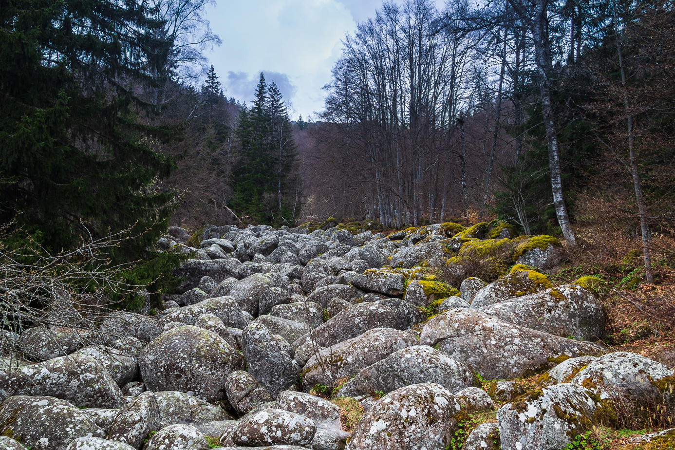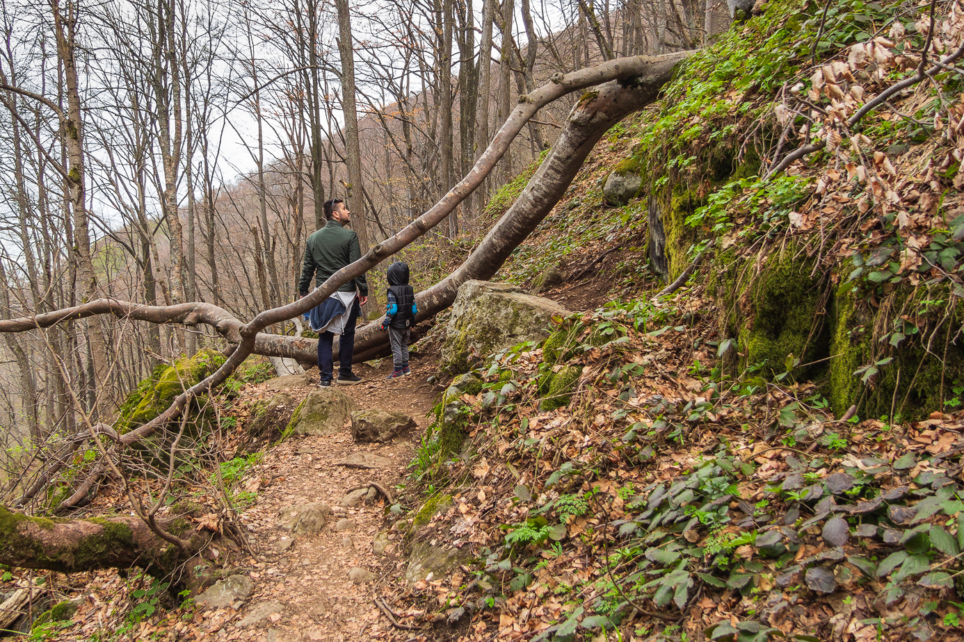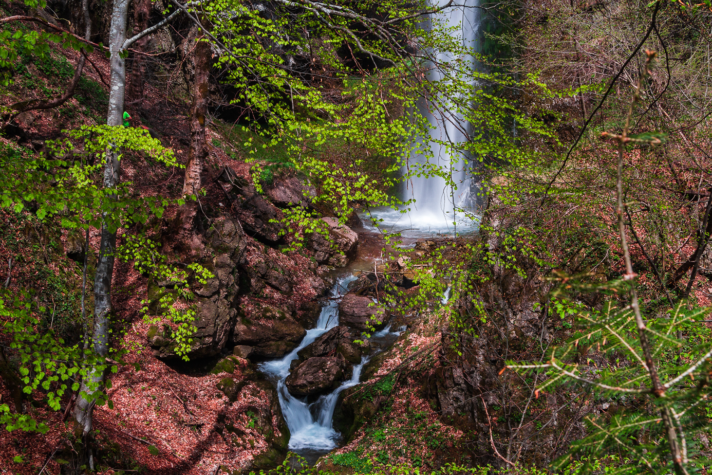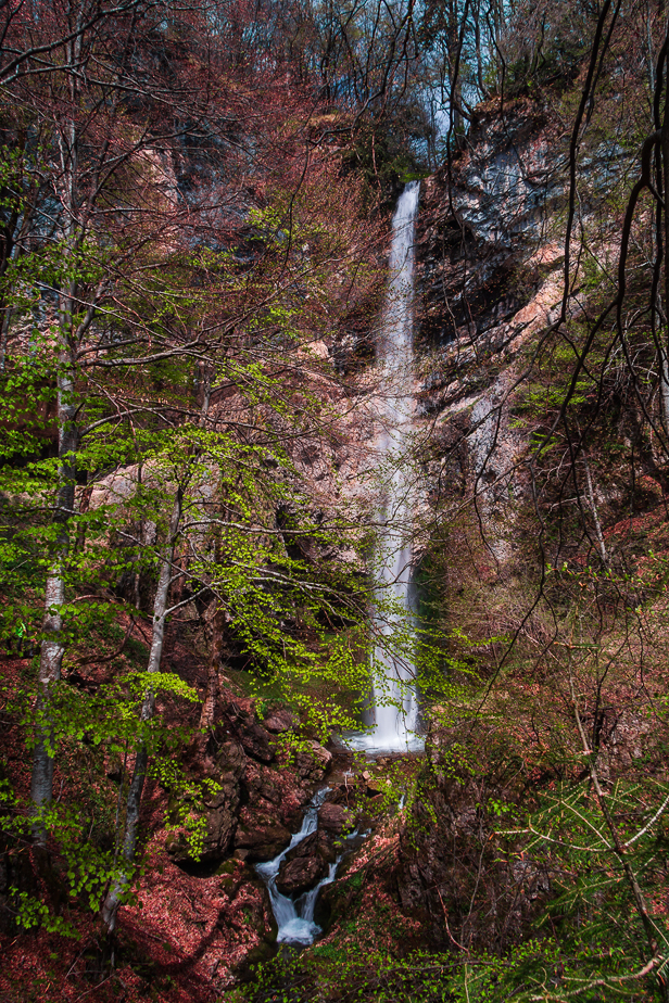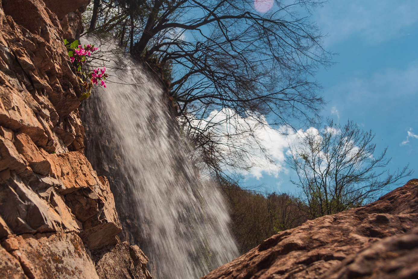 Тук е същински лонгоз – дървета и храсти са се сплели в едно. Вият се диви лози и къпини. Тревата е подгизнала от водата на иначе малкия поток. Скоро пътеката се спуска надолу и се озовавам в центъра на тази „джунгла“. Има нещо което не е както трябва… Вярно – предното ми идване беше преди 8 години, но нямам спомен за толкова растителност. След като вече съм в дъното на дерето трябва да се върна малко назад по течението, за да стигна до водопада. Мдааа, друг е! Доста по-малък е и вероятно лятото изчезва. Снимам го, разбира се и продължавам надолу по дерето, надявайки се, че ще стигна и до големия. Бързо разбирам, че няма да видя друг водопад на този поток. Бреговете стават все по ниски и долчинката се разширява. Илмаз, приятелю, за различни водопади сме си говорили с теб…