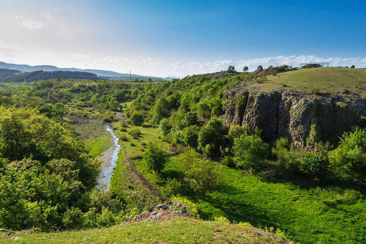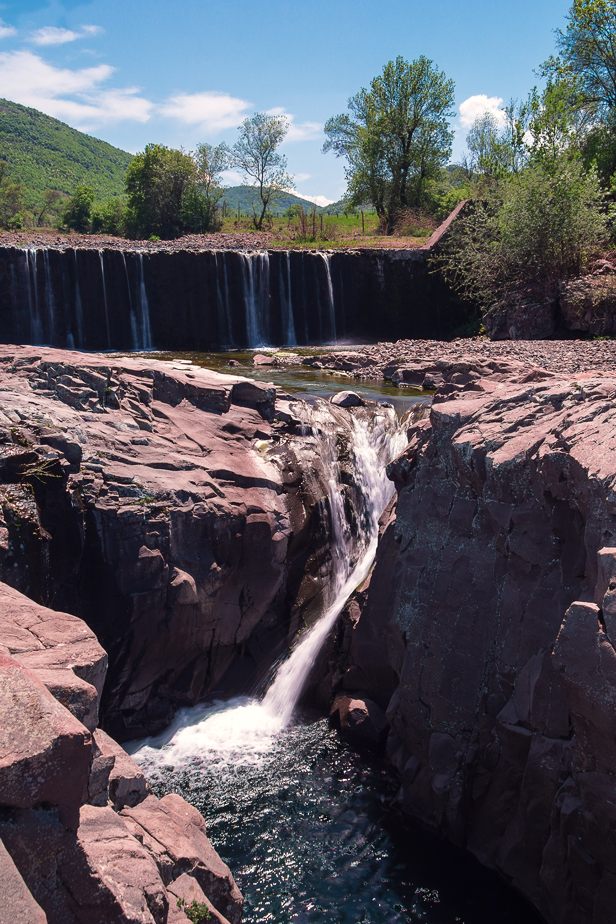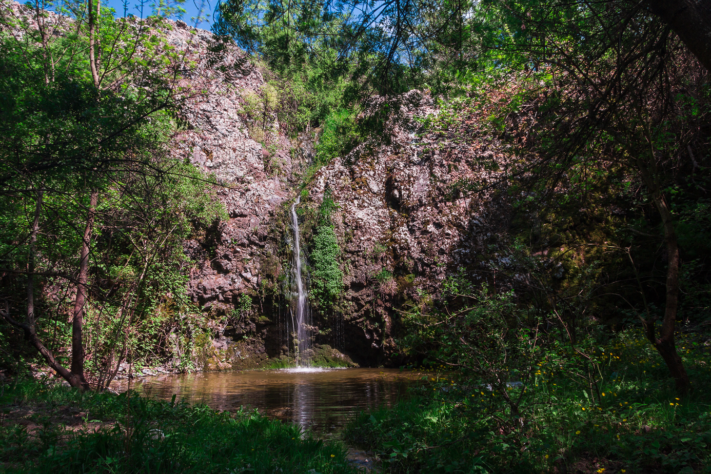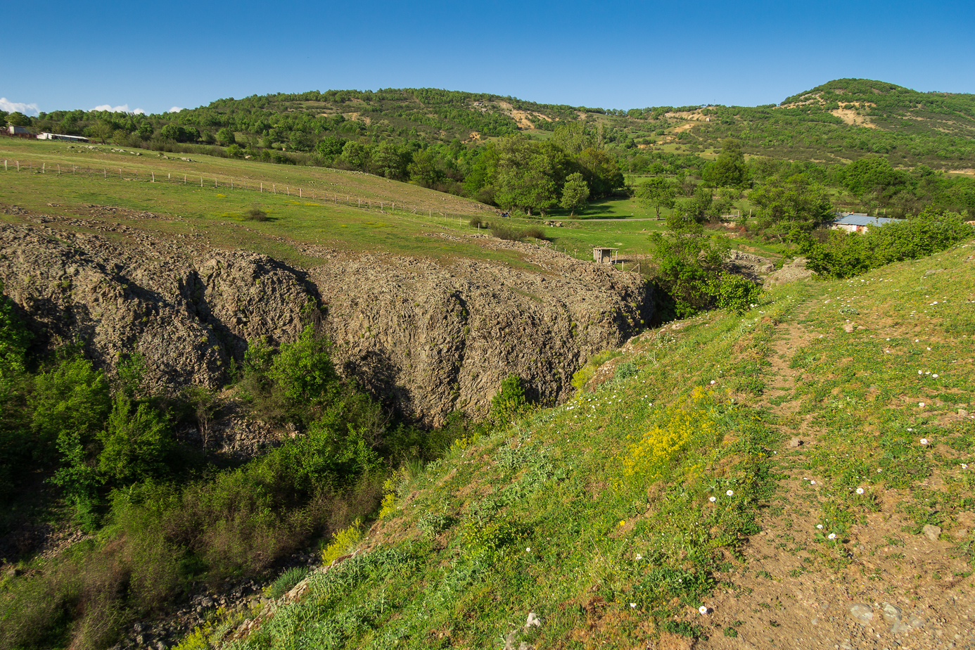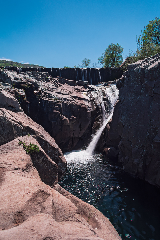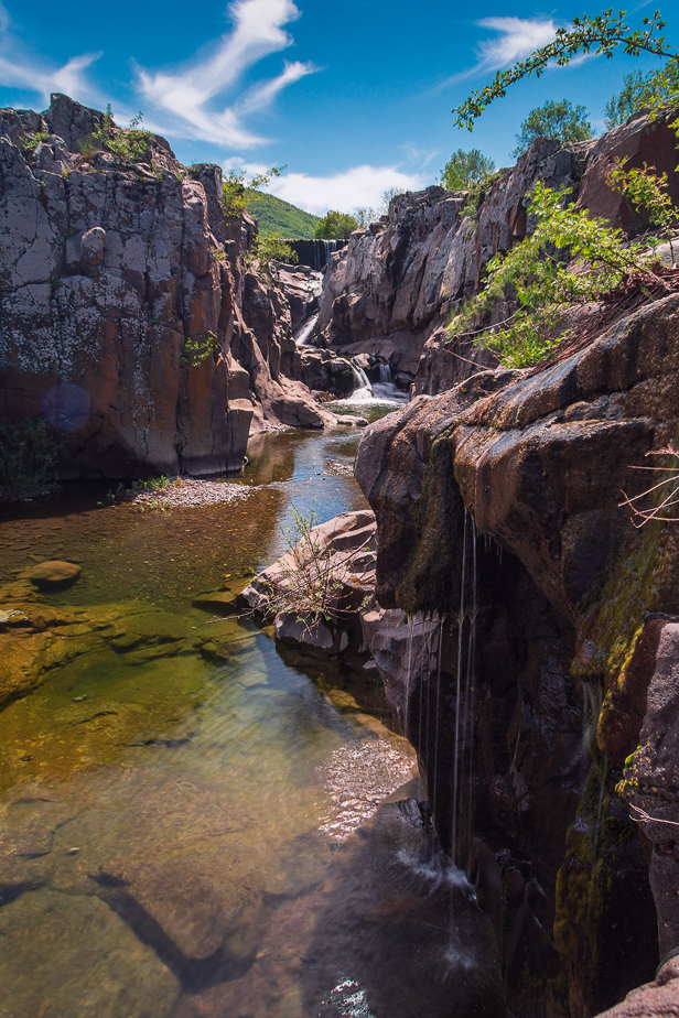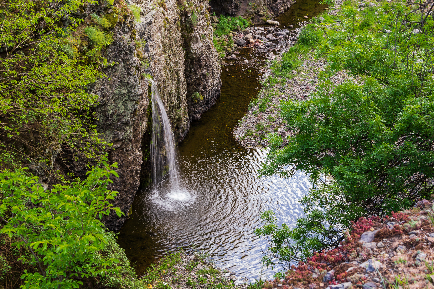 Мотора ми днес не е давал никакви признаци за прегряване, въпреки сериозното изкачване до тук. Решавам, че смяната на охладителната течност му се е отразила добре и съм си решил проблема. Попивам красотата с още по-голямо задоволство. Време е да се спускам надолу. За пореден път дъжда ми се размина и ще мога да си снимам набелязания водопад. След 20-ина минути съм пак в ниското и се оглеждам за удобно място откъдето бих могъл да сляза в поредния мини каньон. Паркирам близо до една кошара. Едрото овчарско куче, което я пази ми е доста сърдито и в началото се опасявам, че ако скъса синджира ще трябва да се изнасям набързо, но щом гася двигателя – то се кротва. Явно е от тия дето не понасят мотори и велосипеди. Този път няма кой да ми наглежда нещата и взимам каската и ръкавиците с мен. Трябва да си намеря път към отсрещния бряг. От моята страна на дерето слизането е невъзможно. Скалите са отвесни, а височината предизвиква свиване на разни части от тялото.