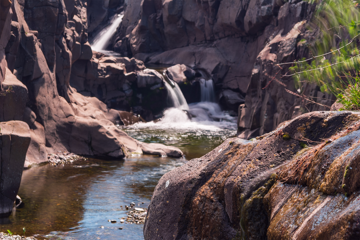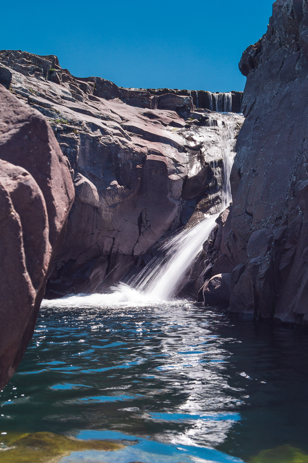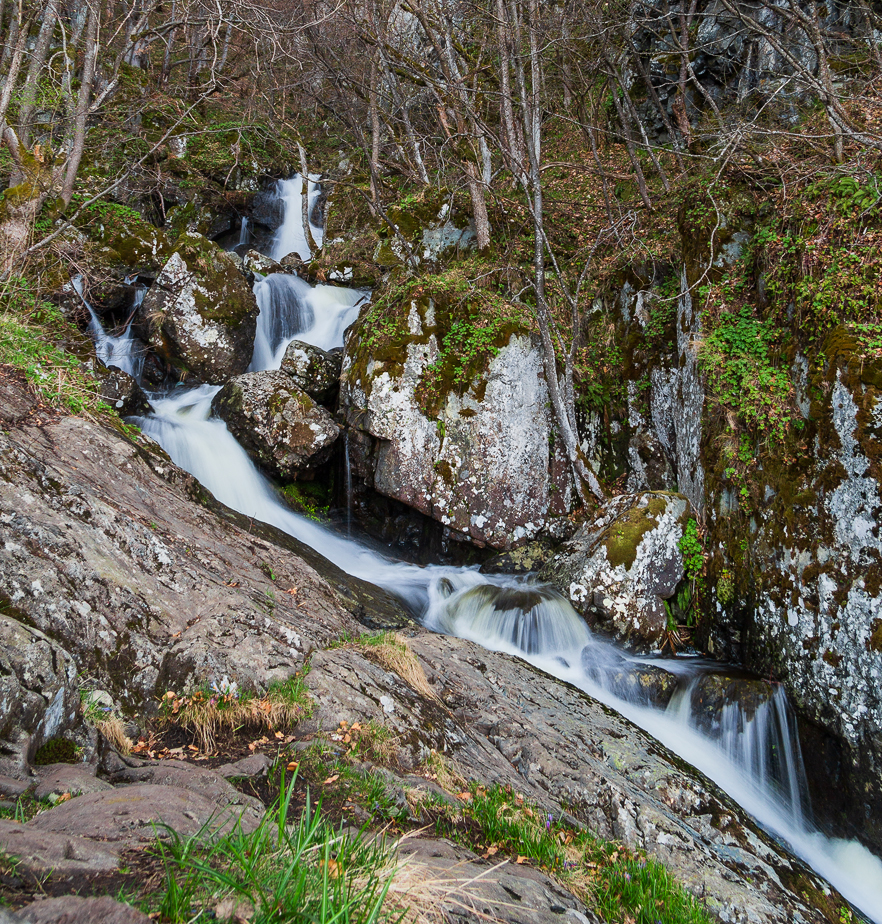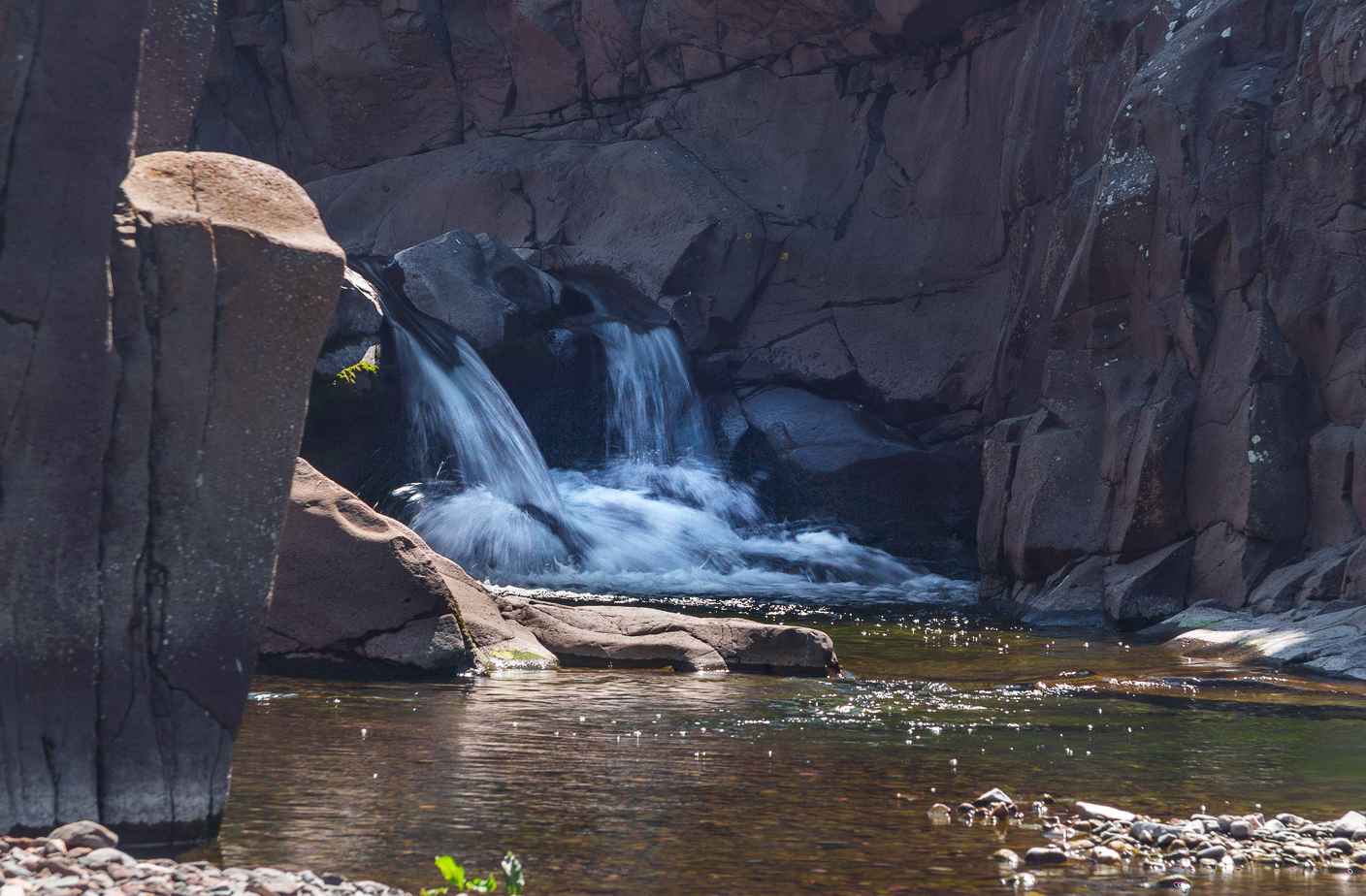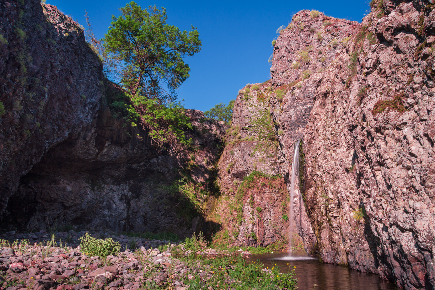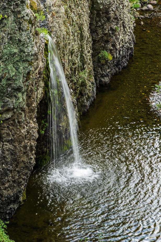 Мотора ми днес не е давал никакви признаци за прегряване, въпреки сериозното изкачване до тук. Решавам, че смяната на охладителната течност му се е отразила добре и съм си решил проблема. Попивам красотата с още по-голямо задоволство. Време е да се спускам надолу. За пореден път дъжда ми се размина и ще мога да си снимам набелязания водопад. След 20-ина минути съм пак в ниското и се оглеждам за удобно място откъдето бих могъл да сляза в поредния мини каньон. Паркирам близо до една кошара. Едрото овчарско куче, което я пази ми е доста сърдито и в началото се опасявам, че ако скъса синджира ще трябва да се изнасям набързо, но щом гася двигателя – то се кротва. Явно е от тия дето не понасят мотори и велосипеди. Този път няма кой да ми наглежда нещата и взимам каската и ръкавиците с мен. Трябва да си намеря път към отсрещния бряг. От моята страна на дерето слизането е невъзможно. Скалите са отвесни, а височината предизвиква свиване на разни части от тялото.