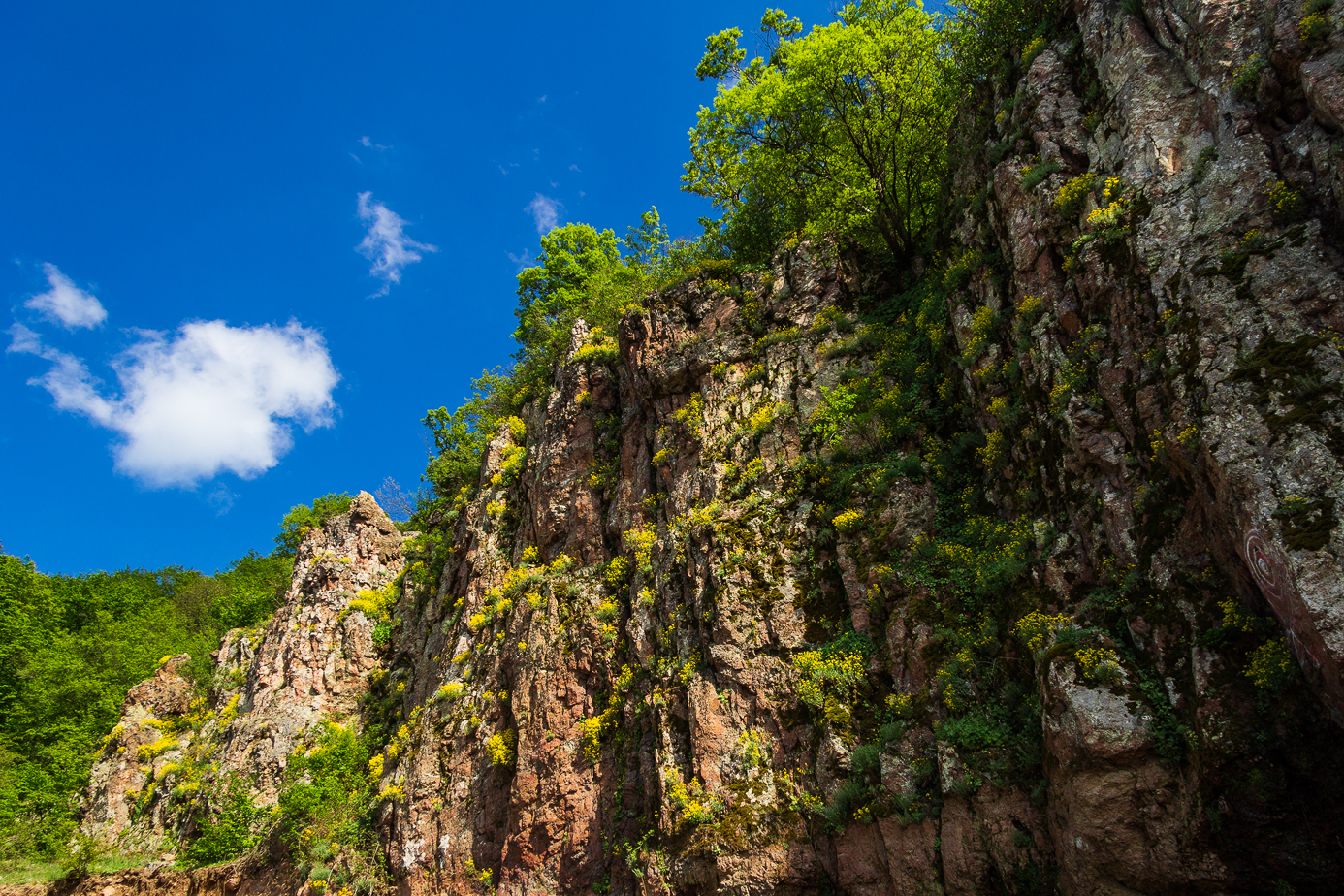 За съжаление вятъра е като в тунел за аеродинамични изпитания – прехвърлил е 10-те метра в секунда и е неприятно да се стои на скалите, да не говорим да се снима. Дори и да разпъна статива, ще бъде съборен заедно с фотоапарата. Щраквам няколко кадъра от ръка и бързам да продължа нататък, където пътя влиза пак в гората. Родопа отново ме скътва в пазвите си и се държи мило. Стигам до паркинг с навеси, чешми и висока скална стена вдясно от пътя. Скалите са окичени с нацъфтели в жълто букети, които направо бодат очите огрени от слънцето. Има няколко коли с мъже, на чешмите се пълнят туби с вода. Магично място. По протежението на цялата скална стена в основата ѝ тече вода. Все едно гигантски сюнгер се отцежда в каменните корита. Питам чичовците дали това е Дамбалъ, понеже виждам, че пътя продължава нататък. Казват, че това е мястото, а нататък има още само няколкостотин метра асфалт и пътя свършва при голяма поляна, където се правят съборите. Казват ми че трябва да ида и там да снимам, щото било много красиво и се виждало надалече. Разказват как тук се събират много хора на 5-ти срещу 6-ти май. Точно в полунощ ставало чудото – водата теквала целебна. Идвали хора от близо и далеч.