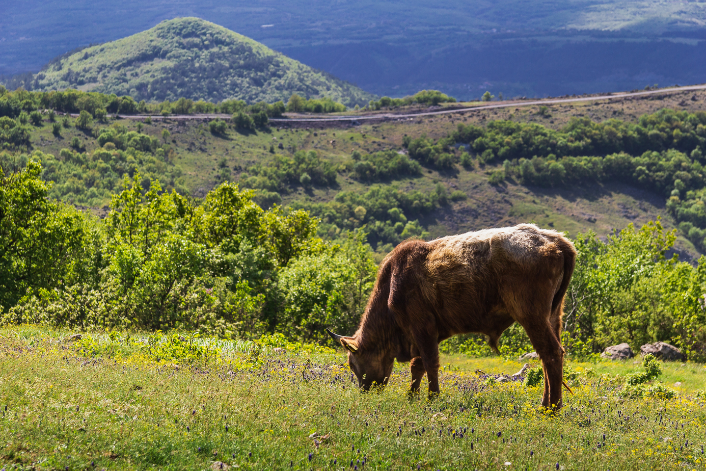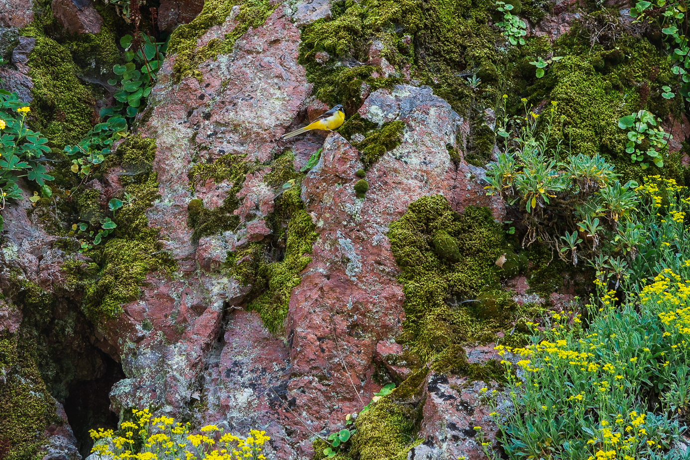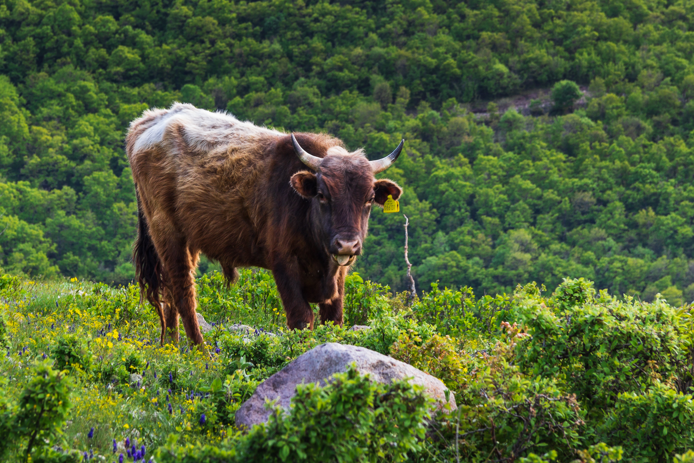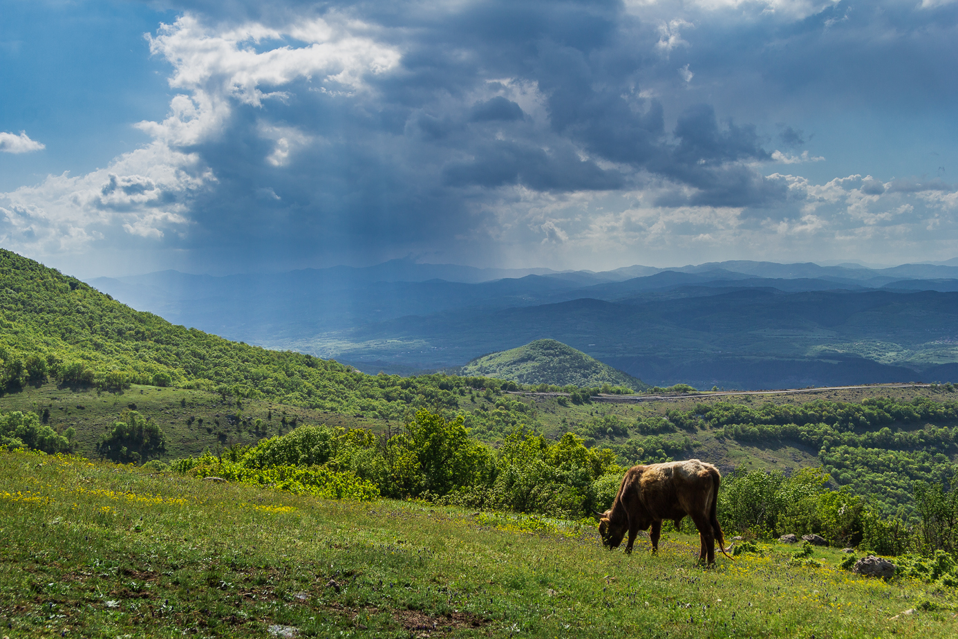 „Ние идваме от Турция“ – споделя единият от мъжете. Друг вади телефон и ми показва снимки от зимата – скалите са като от филм за Снежната кралица – целите са в ледени сталактити. Питам го как е успял да се изкачи дотук зимно време – „пеш“ казва – „колата оставям долу в ниското“ – предполагам има предвид Летовник или най-много махалата с кошарите. Не го разпитвам за детайлите, а се впускам да снимам привлечен от красиво яркожълто пиле прехвръкващо между колите и скалния масив пред мен. Успявам да го отстрелям в няколко кадъра. Пия вода от чешмата, сбогувам се с чичовците и отиваме с коня да пасем на голямата поляна. Е, на коня не му било писано – на поляната няма как да излезе през камъните и храсталака. Зарязвам го в края на пътя и тръгвам сам по пътеката. Излизам на откритото огряно от светещото насреща ми слънце и се озовавам очи в очи с друго говедо. Гледаме се мълчаливо известно време, после то продължава веганската си дегустация, а аз се заемам със снимките. Вятъра е отслабнал значително, буреносните облаци са далече пред мен над долината и само украсяват пейзажа. Пчелички, цветенца, аромат на билки и две щастливи говеда… а и един железен кон малко по-нагоре.